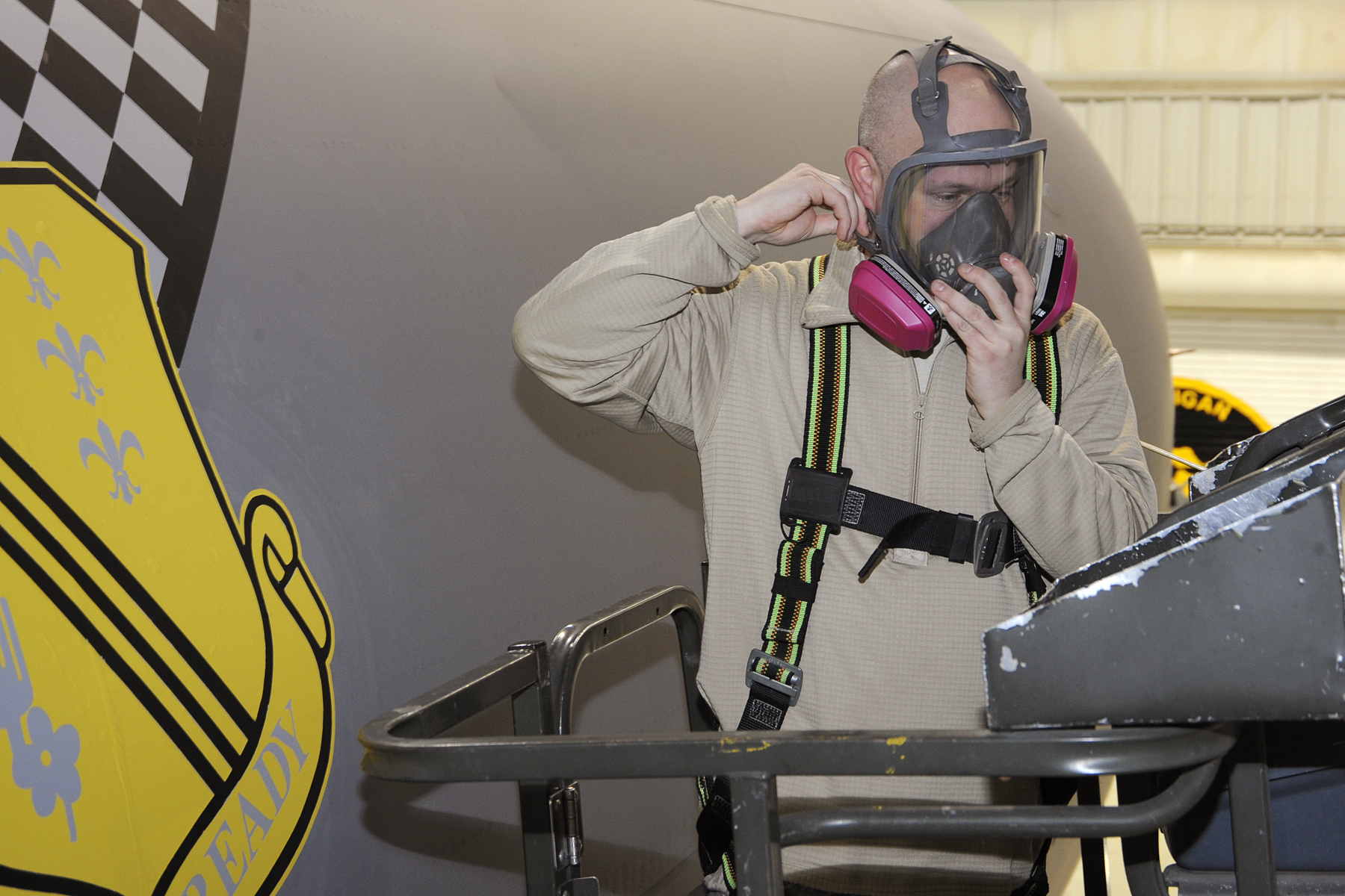 The correct personal protective equipment is essential to accomplishing any task. Here, prior to applying paint to a KC-135 Stratotanker, SSgt. Brian Harris dons a breathing mask, Jan. 16, 2013. He is already wearing a harness to ensure safety as he stands in a hydraulic lift, needed to reach that portion of the aircraft. Before beginning painting, he will also put on a thin pair of gloves to protect his hands. Harris is assigned to the 191st Maintenance Squadron at Selfridge Air National Guard Base, Mich. (Air National Guard photo by John S. Swanson)